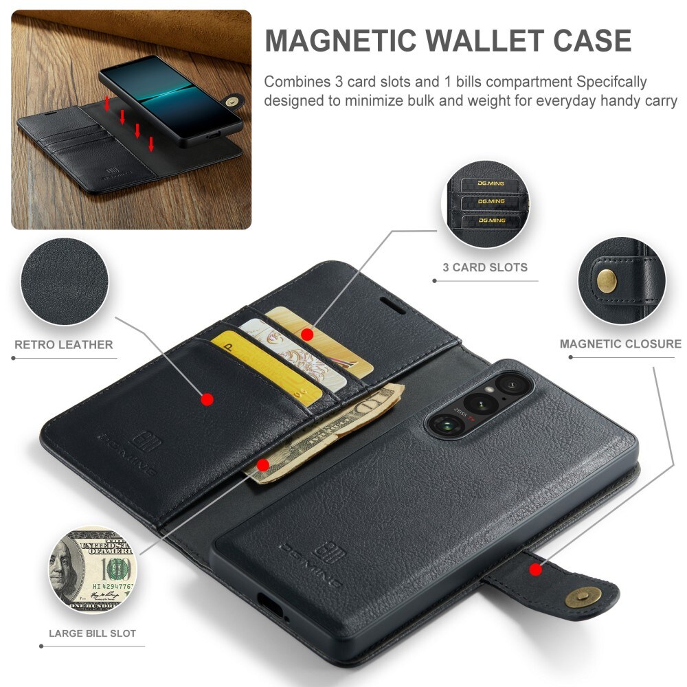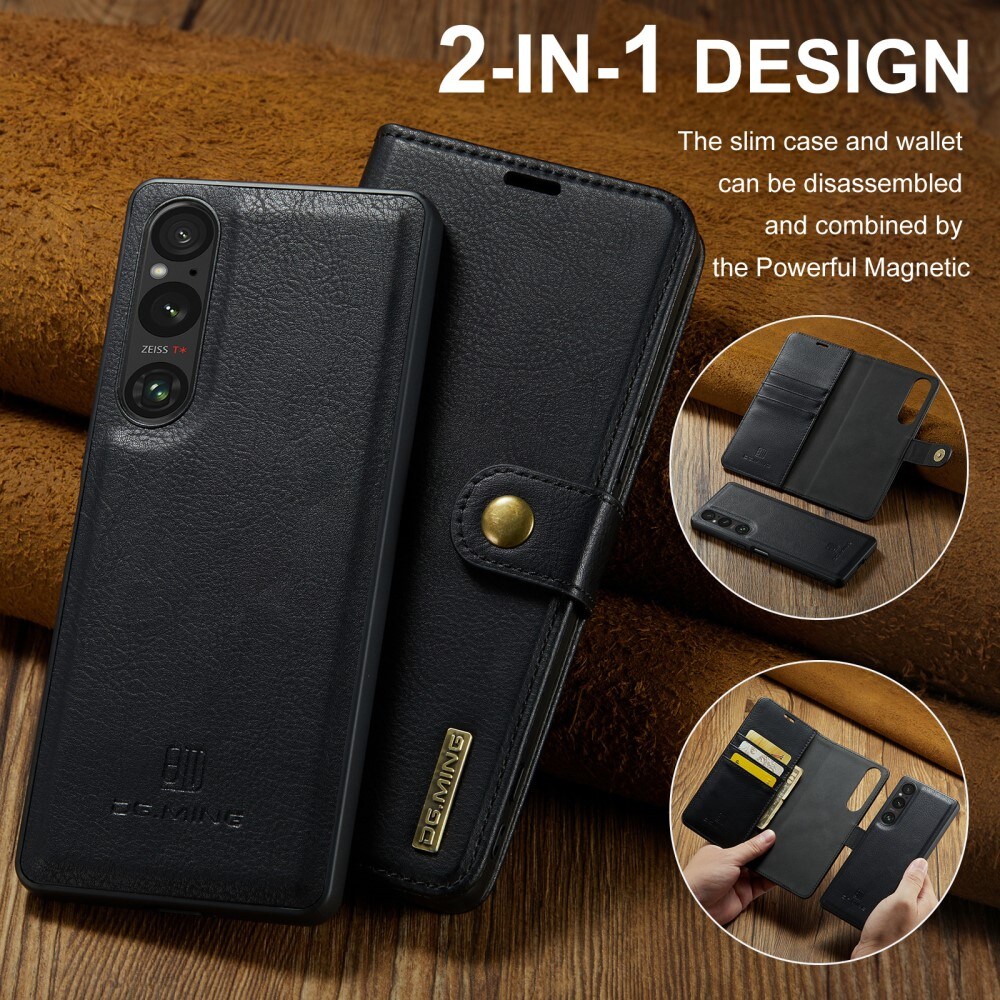 2-in-1-hoesje bestaande uit een bookcoverhoesje met daarin een afneembare magneet-backcase voor Sony Xperia 1 VI van DG.MING. Het hoesje heeft een klassieke en stijlvolle uitstraling. Eenvoudig losnemen van je telefoon in het backcover hoesje om enkel je mobiel te gebruiken, bijvoorbeeld thuis of op werk.