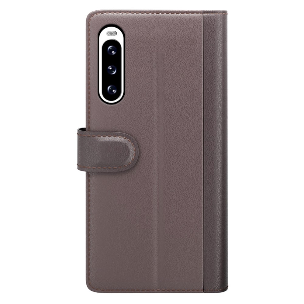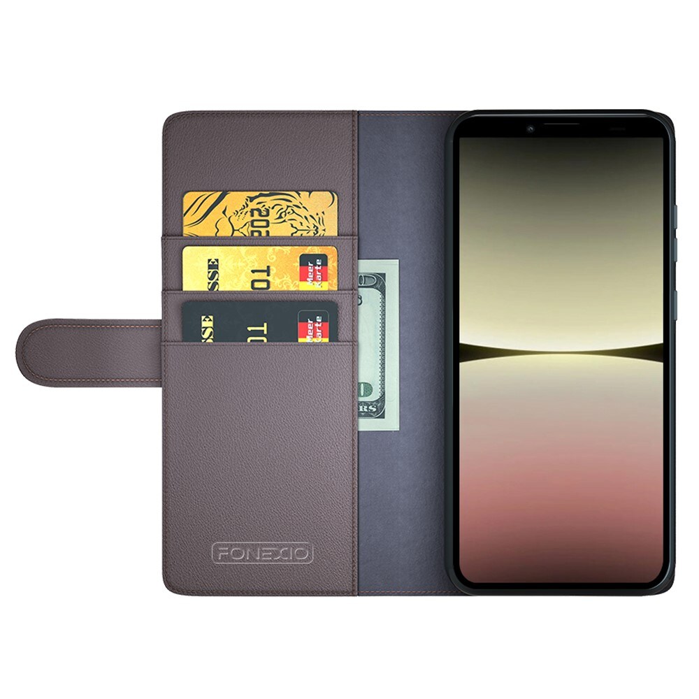 Bookcover hoesje van echt leer voor de Sony Xperia 10 V Het hoesje beschermt je hele telefoon en heeft plek voor pasjes aan de binnenkant van de voorflap. De pasjeshouder heeft drie vakken en een groter vakje voor briefgeld of bonnetjes.