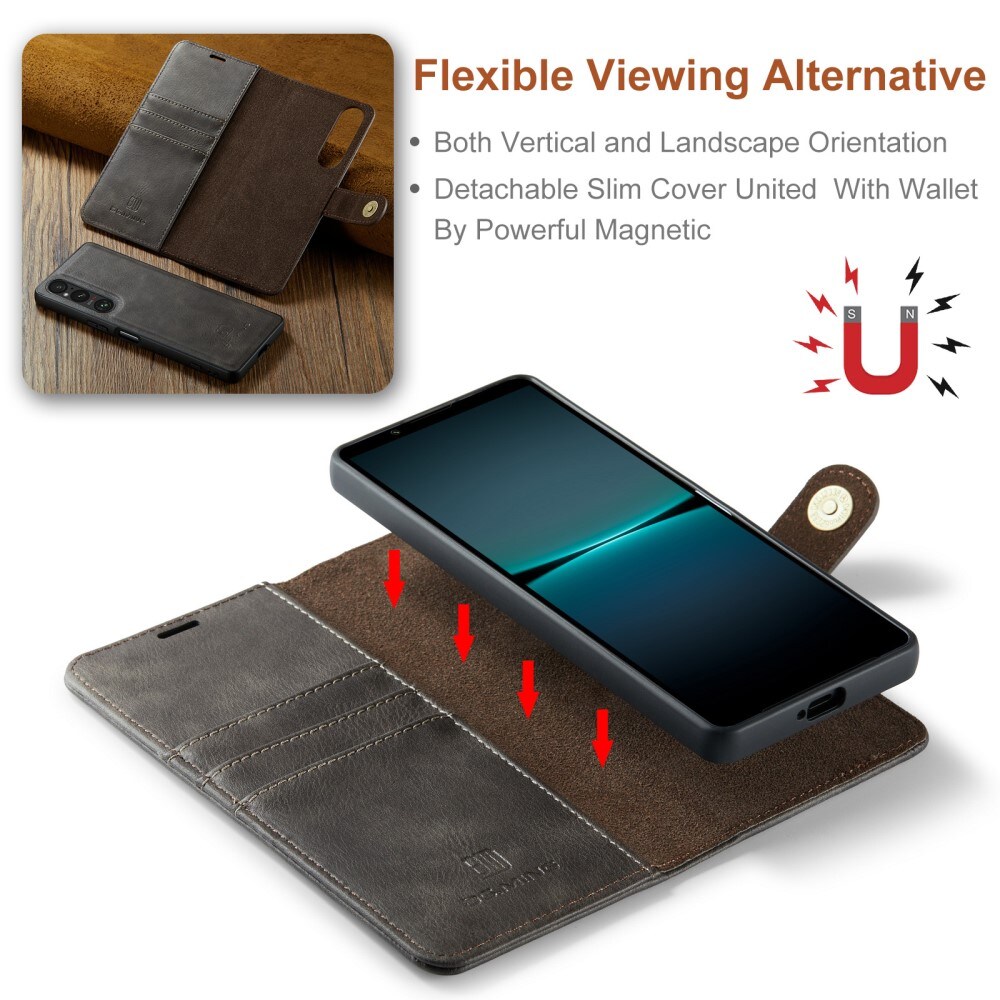 2-in-1-hoesje bestaande uit een bookcoverhoesje met daarin een afneembare magneet-backcase voor Sony Xperia 5 V van DG.MING. Het hoesje heeft een klassieke en stijlvolle uitstraling. Eenvoudig losnemen van je telefoon in het backcover hoesje om enkel je mobiel te gebruiken, bijvoorbeeld thuis of op werk.