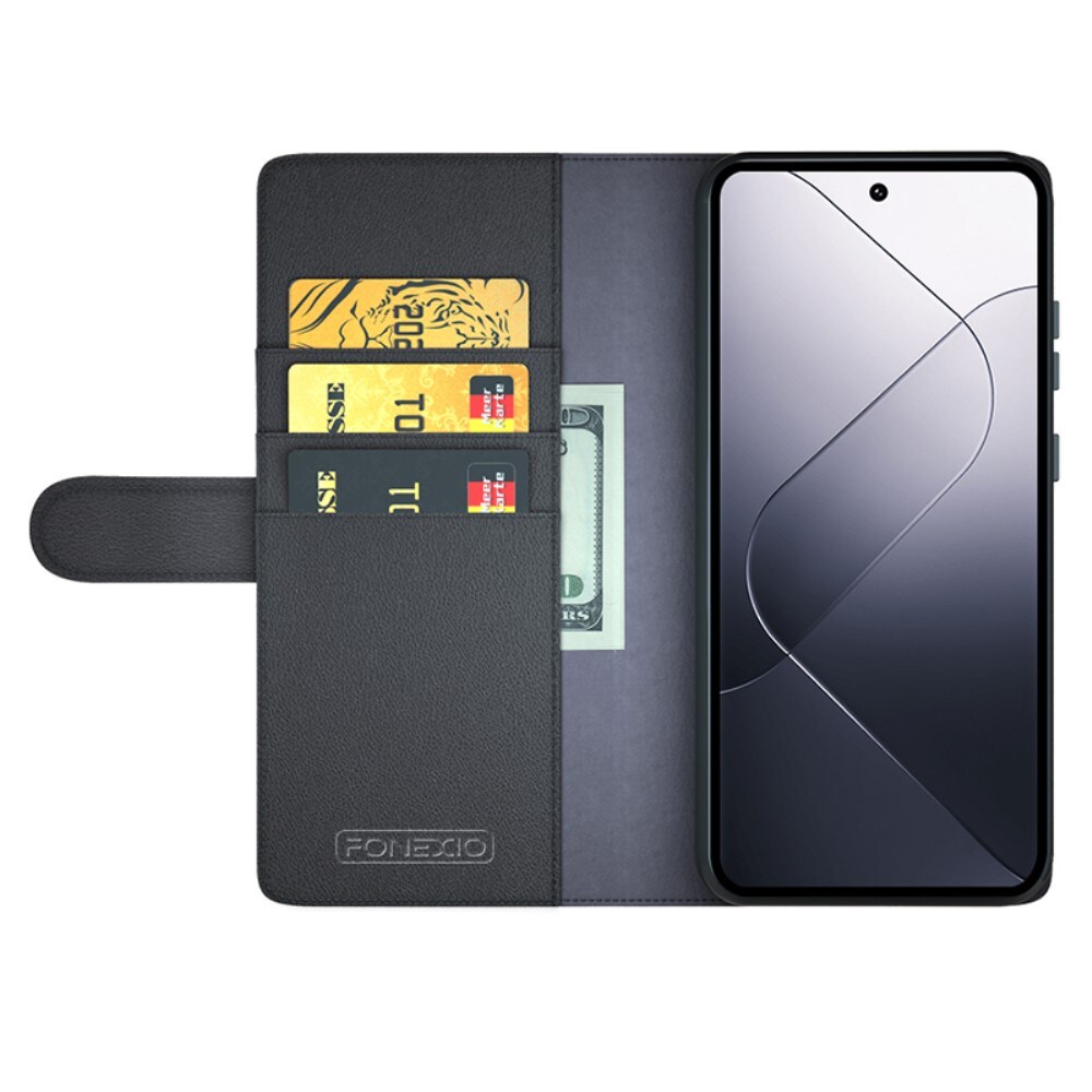 Bookcover hoesje van echt leer voor de Xiaomi 14 Het hoesje beschermt je hele telefoon en heeft plek voor pasjes aan de binnenkant van de voorflap. De pasjeshouder heeft drie vakken en een groter vakje voor briefgeld of bonnetjes.